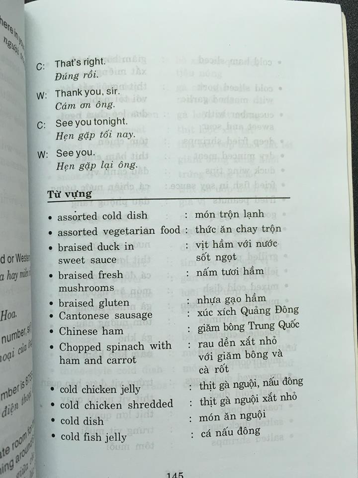 Cuốn sách dành cho người học từ vựng, mẫu câu giao tiếp trong nhà hàng, du lịch, khách sạn.